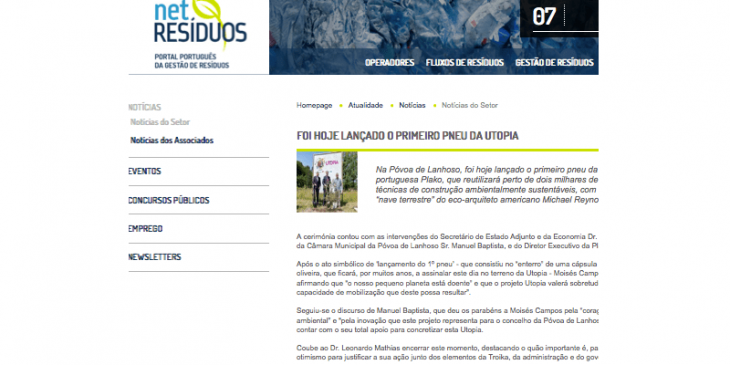 Artigo publicado no website da NetResíduos, sobre o lançamento do 1º pneu da Utopia, a 9 de setembro de 2014.