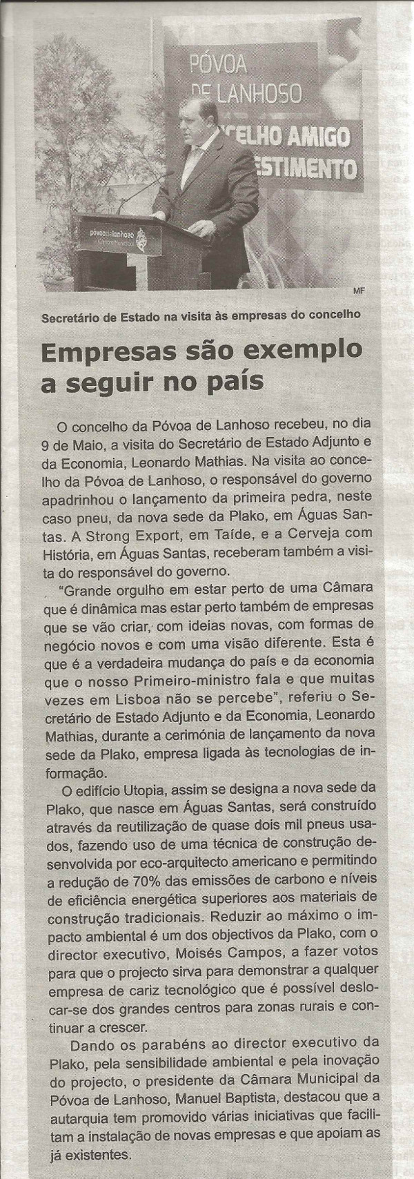 Article published in the newspaper Maria da Fonte about the visit of the Secretary of State to companies in the municipality of Póvoa de Lanhoso, on May 25, 2014.