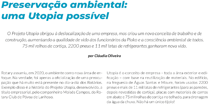 Rotary took on the environment as a new area of focus in 2020. In fact, it was only the officialization of a concern that has long been present in the daily lives of Rotarians. An example of this is the history of Project Utopia, developed, as a business, by fellow Moisés Campos, from the Rotary Club of Póvoa de Lanhoso.