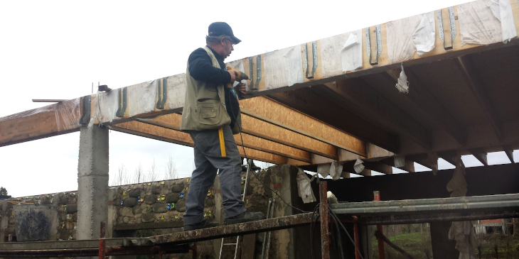It took the strength of 5 people to transport and place "by hand" the 2 laminated beams about 13 meters long, 12cm wide and 32 high.